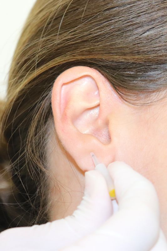 Después de la desinfección del pabellón auricular y la anestesia local, se implantan las agujas en los puntos correspondientes. La aplicación de estos microimplantes se realiza mediante un sistema de presión casi indoloro.